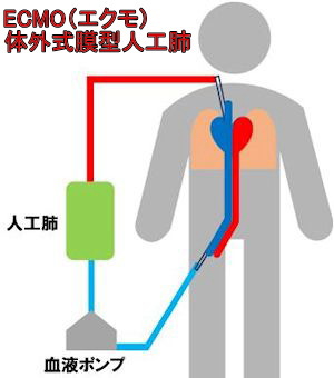 ※ECMO(エクモ):体外式膜型人工肺=重症呼吸不全患者または重症心不全患者に対して(時に心肺停止状態の蘇生手段として)行われる生命維持法。