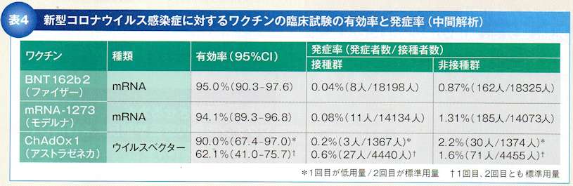 インフルエンザに対する不活化ワクチンの有効率はおよそ40~50%程度ですが、新型コロナウイルスのワクチンはこれより大幅に有効率が高く、臨床試験の中間報告としてファイザー社のmRNA(メッセンジャーRNA)ワクチンでは95.O%、モデルナ社のmRNA(メッセンジャーRNA)ワクチンでは94.1%の有効率が得られています(表4)。