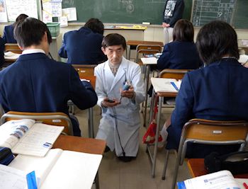 学習指導要領の改訂に伴い、2012(平成24)年度から中学校保健体育で「医薬品の正しい使い方」の学習が組み込まれました。生涯を通してくすりから無縁で過ごすことは考えられません。くすりは正しく使えば薬ですが誤った使い方をすれば害を及ぼすこともあります。また、危険ドラッグや違法薬物乱用などの防止活動も行っています。クスリの専門的知識を持っている薬剤師と教師とがチームを組んで(チームティーチング)くすり授業への参加や補助資料作成のお手伝いをしています。