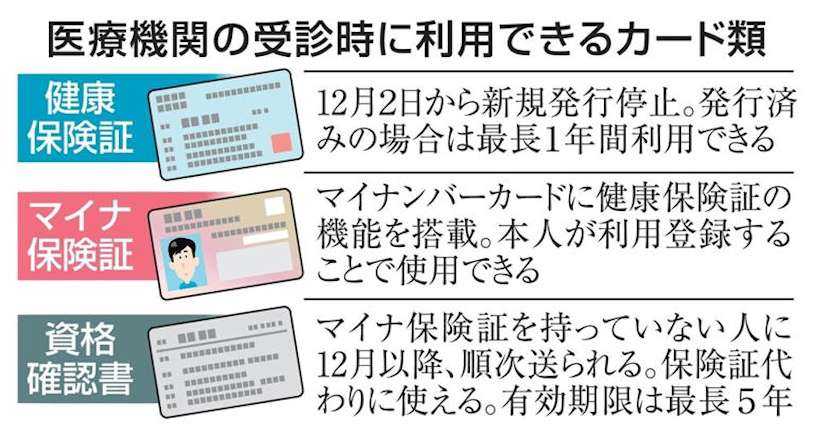 健康保険証は廃止期限以降、新規発行されなくなる。発行済みの保険証は猶予期間があり、期限後も最長1年間(25年12月1日まで)は使用できる。