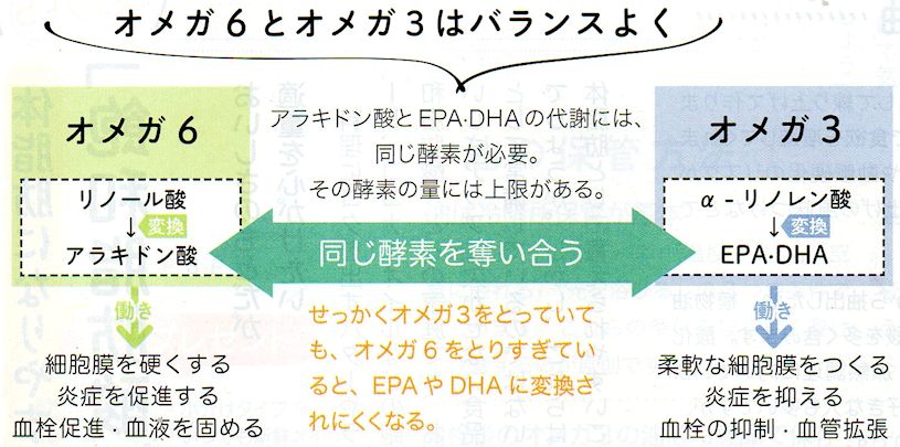 【オメガ6】に酵素が奪われると、【オメガ3】の変換が進まなくなってしまうのですよ!。