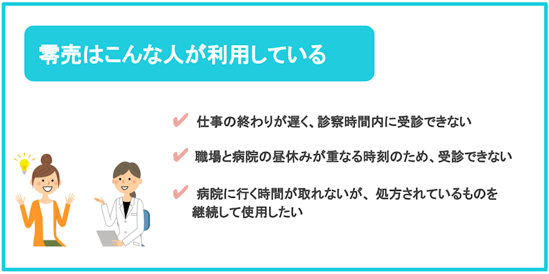 ただし、「一般用医薬品の販売による対応を考慮したにもかかわらず、やむを得ず販売を行わざるを得ない場合などにおいては、必要な受診勧奨等を行い販売することが可能」と、先にも紹介した資料「処方箋医薬品以外の医療用医薬品の販売方法等の再周知について」に示されており、ヒアリングや指導などを適切に行った上で薬剤師による対面販売をするのであれば、現時点では法的に問題がありません。